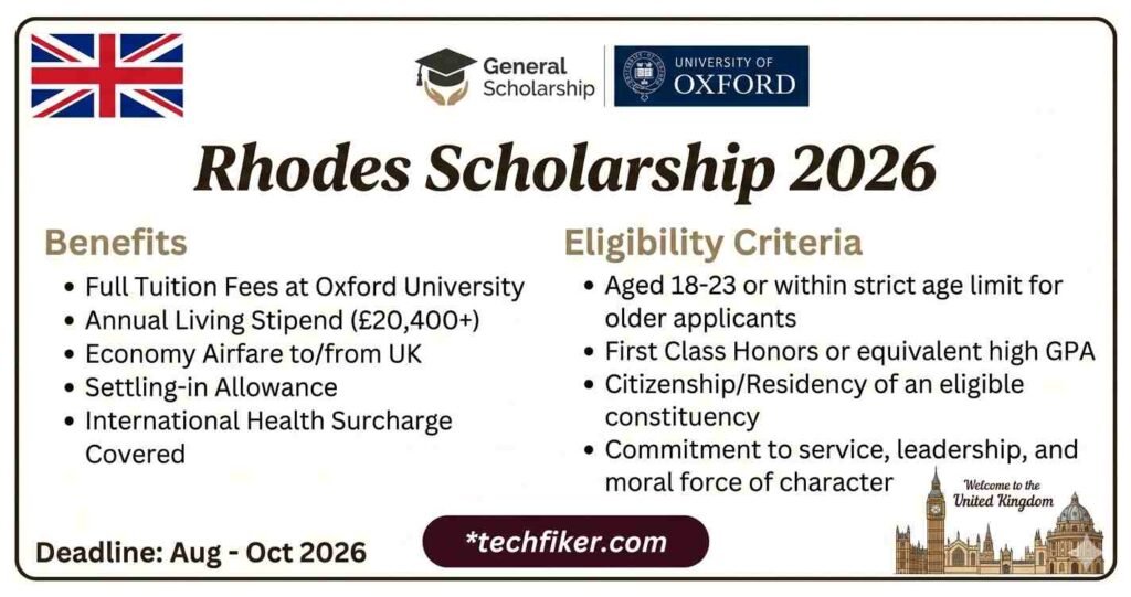 The Rhodes Scholarship 2026 stands as one of the world’s most prestigious and fully funded scholarships, offering exceptional students the chance to study at the University of Oxford. If you are looking for postgraduate scholarships 2026 that cover every expense—from tuition fees to airfare—this is the pinnacle of academic opportunity.